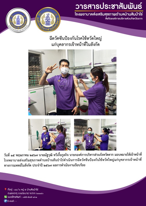 15 พ.ค.2567 รพ.สต.บ้านสันป่าไร่ ฉีดวัคซีนป้องกันไข้หวัดใหญ่ บุคลากรทางการแพทย์ ประจำปี พ.ศ.2567