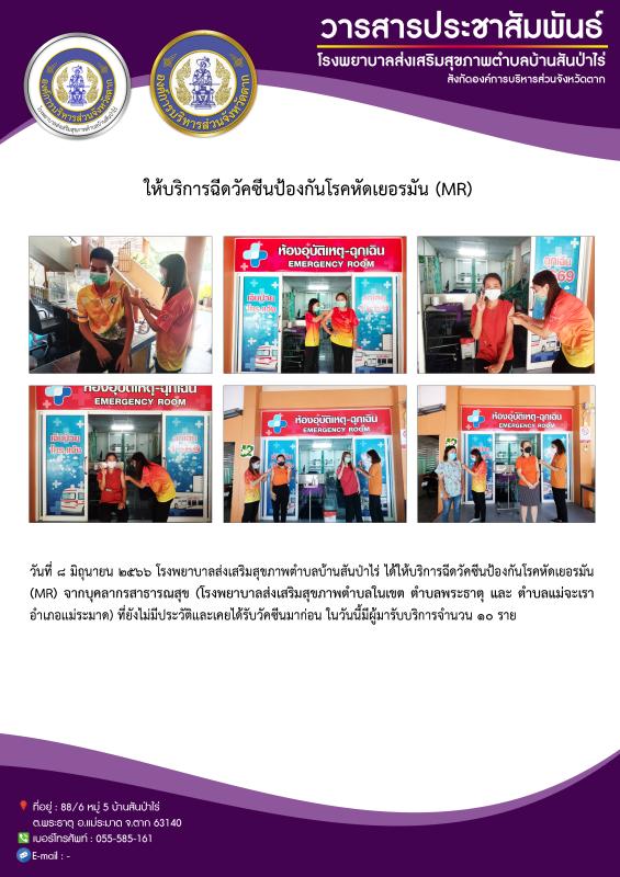 8 มิ.ย. 66 รพ.สต.บ้านสันป่าไร่ ฉีดวัคซีนป้องกันโรคหัด,หัดเยอรมัน(MR) บุคลากรสาธารณสุข (รพ.สต.ในเขต ต.พระธาตุ และ ต.แม่จะเรา อำเภอแม่ระมาด)ที่ยังไม่มีประวัติเคยได้รับวัคซีนมาก่อน จำนวน 10 ราย