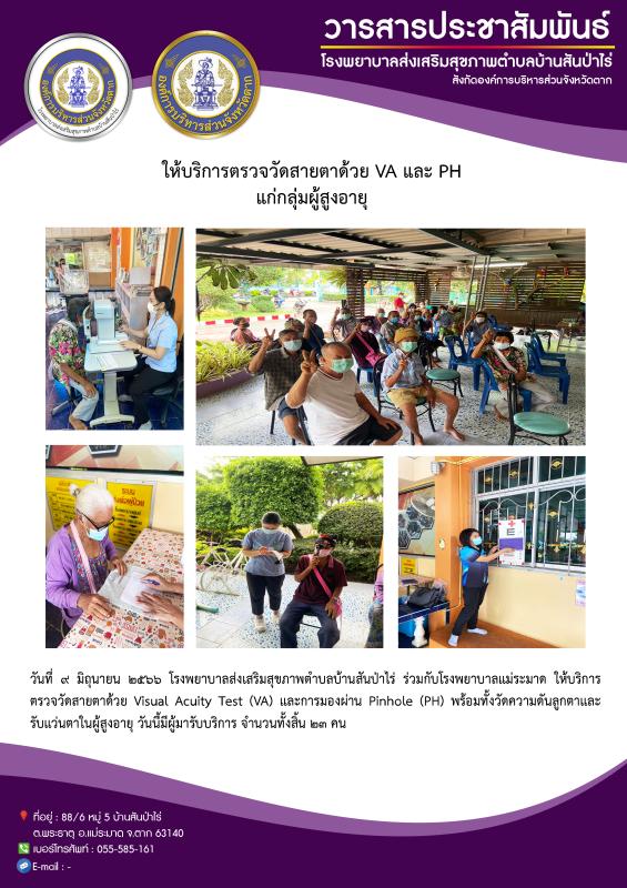 9 มิ.ย. 66 รพ.สต.บ้านสันป่าไร่ร่วมกับรพ.แม่ระมาด ให้บริการตรวจตา ตรวจVA , PH , วัดความดันลูกตาและรับแว่นตา ในผู้สูงอายุ จำนวน 23 คน