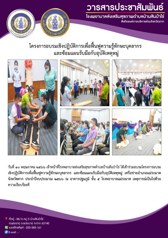 วันที่10 พฤษภาคม 2566 จนท.รพ.สต.บ้านสันป่าไร่ เข้าร่วมอบรมโครงการอบรมเชิงปฏิบัติการเพื่อฟื้นฟูความรู้ทักษะบุคลากร และซ้อมแผนรับอุบัติเหตุหมู่ เครือข่ายอำเภอแม่ระมาด จังหวัดตาก ปีงบประมาณ 2566 ณ อาคาร ปฐมภูมิชั้น 5 โรงพยาบาลแม่ระมาด