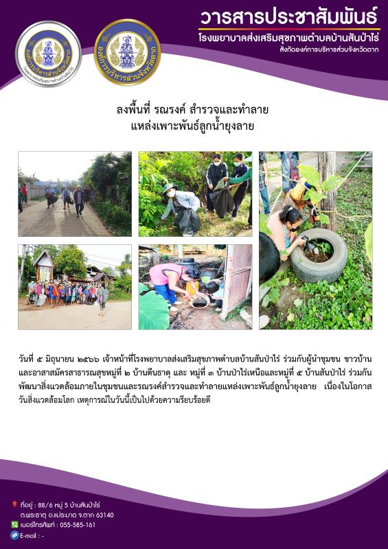 5 มิ.ย. 66 จนท.รพ.สต.บ้านสันป่าไร่ ร่วมกับผู้นำชุมชน ชาวบ้านและอาสาสมัครสาธารณสุขหมู่ที่ 2 บ้านตีนธาตุ หมู่ที่ 3 บ้านป่าไร่เหนือและหมู่ที่ 5 บ้านสันป่าไร่ พัฒนาสิ่งแวดล้อมภายในชุมชนและรณรงค์สำรวจและทำลายแหล่งเพาะพันธ์ลูกน้ำยุงลาย เนื่องในวันสิ่งแวดล้อมโลก