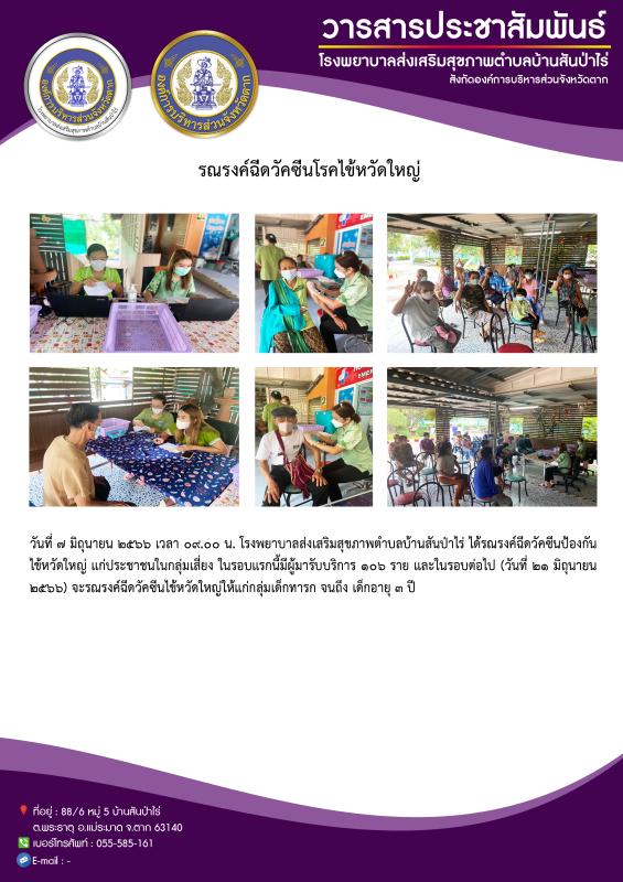 7 มิ.ย. 66 ช่วงเช้า รพ.สต.บ้านสันป่าไร่ รณรงค์ฉีดวัคซีนป้องกันไข้หวัดใหญ่ กลุ่มเสี่ยง รอบแรก มีผู้มารับบริการ 106 ราย รอบต่อไป(วันที่21)กลุ่มเด็กอายุ 6 เดือน ถึง 2ปี 11เดือน