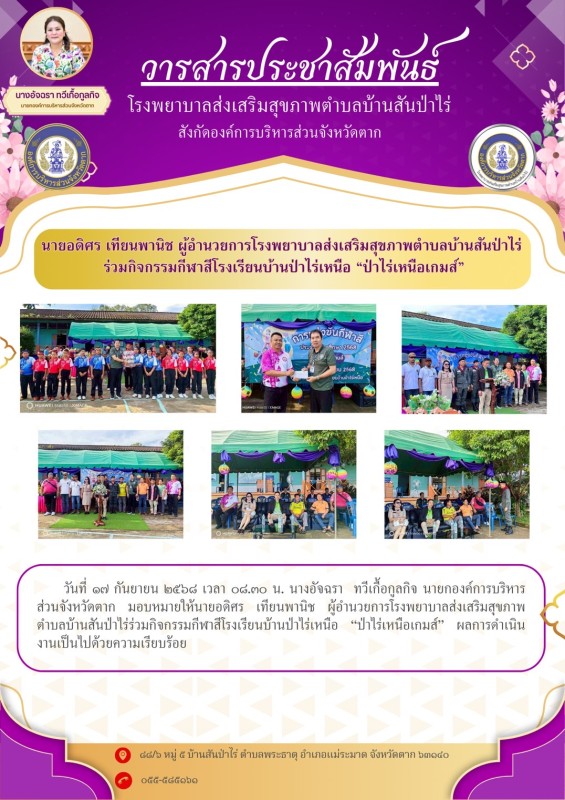 17 กันยายน 2568 นางอัจฉรา ทวีเกื้อกูลกิจ นายกองค์การบริหารส่วนจังหวัดตาก มอบหมายให้ นายอดิศร เทียนพานิช ผอ.รพ.สต.บ้านสันป่าไร่ ร่วมกิจกรรมกีฬาสีโรงเรียนบ้านป่าไร่เหนือ“ป่าไร่เหนือเกมส์”