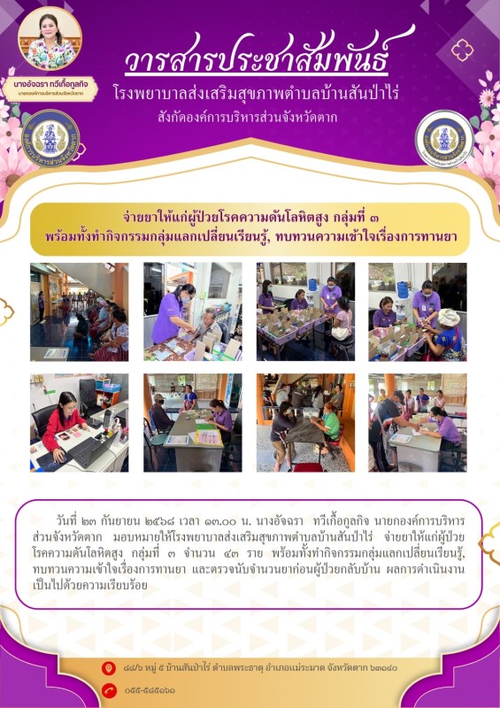 23 ก.ย.68 รพ.สต.บ้านสันป่าไร่ จ่ายยาให้แก่ผู้ป่วยโรคความดันโลหิตสูง กลุ่มที่ 3 จำนวน 43 ราย พร้อมทั้ง ทำกิจกรรมกลุ่มแลกเปลี่ยนเรียนรู้ , ทบทวนความเข้าใจเรื่องการทานยาและตรวจนับจำนวนยาก่อนผู้ป่วยกลับบ้าน