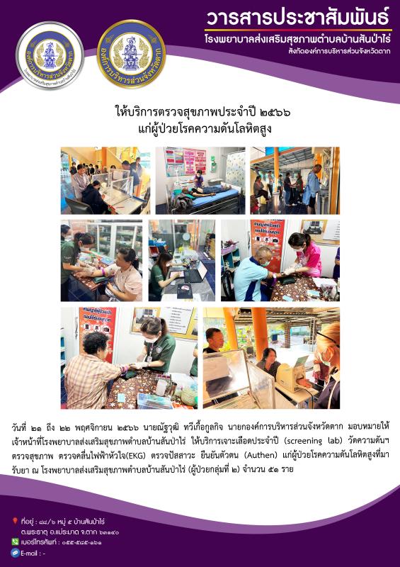 21-22 พ.ย.66 รพ.สต.บ้านสันป่าไร่ เจาะเลือดประจำปี( screening lab ), วัดความดันฯ , ตรวจสุขภาพ , ตรวจคลื่นไฟฟ้าหัวใจ(EKG) , ตรวจปัสสาวะ ผู้ป่วยโรคความดันโลหิตสูงที่รับยาที่ รพ.สต.บ้านสันป่าไร่ กลุ่ม 2 จำนวน 51 ราย