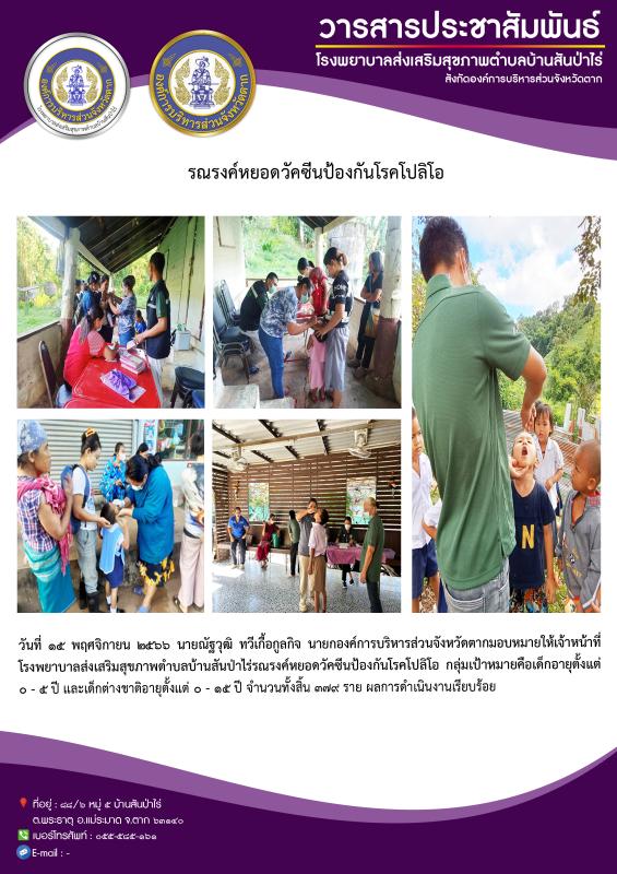 15 พ.ย.66 รพ.สต.บ้านสันป่าไร่ รณรงค์หยอดวัคซีนป้องกันโรคโปลิโอ รอบแรก แก่เด็กไทยอายุ 0-5 ปี และเด็กต่างชาติอายุ 0-15 ปี จำนวน 379 ราย และนัดหมายรณรงค์ รอบสอง(วันที่ 19 ธ.ค.66)