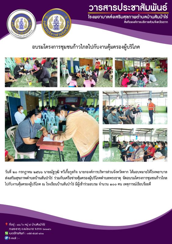 20 ก.ค.66 จนท.รพ.สต.บ้านสันป่าไร่ร่วมกับเครือข่ายคุ้มครองผู้บริโภคตำบลพระธาตุจัดอบรมโครงการชุมชนก้าวไกลไปกับงานคุ้มครองผู้บริโภค ณ โรงเรียนบ้านสันป่าไร่ มีผู้เข้าร่วมอบรม จำนวน 100 คน