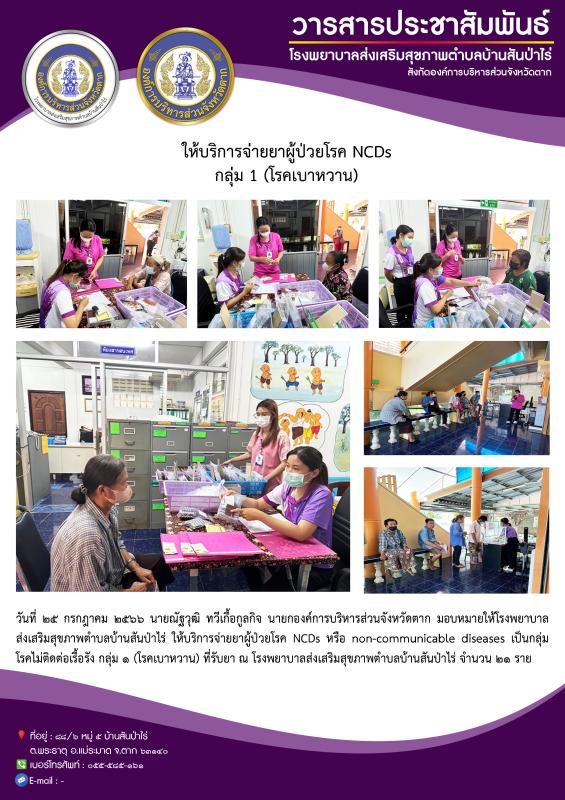 25 ก.ค. 66 รพ.สต.บ้านสันป่าไร่ ให้บริการจ่ายยาผู้ป่วยโรคไม่ติดต่อ กลุ่ม 1 (โรคเบาหวาน) ที่รับยาที่ รพ.สต.บ้านสันป่าไร่ จำนวน 21 ราย