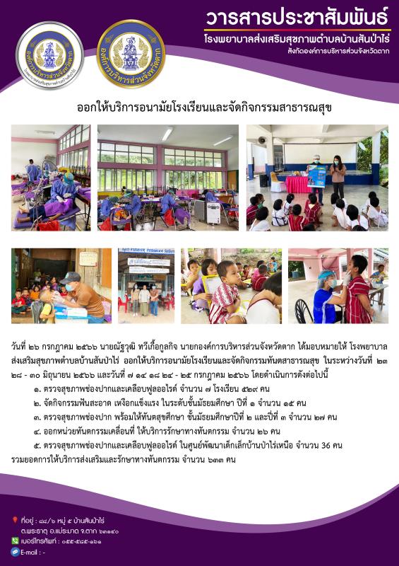 วันที่ 23/6/66 - 25/7/66 จนท.รพ.สต.บ้านสันป่าไร่ ออกให้บริการอนามัยโรงเรียนและจัดกิจกรรมทันตสาธารณสุข โดยดำเนินการ 1.ตรวจสุขภาพช่องปากและเคลือบฟูลออไรด์ จำนวน 7 โรงเรียน 529 คน 2.จัดกิจกรรมฟันสะอาด เหงือกแข็งแรง ในระดับชั้นมัธยมศึกษา ปีที่1 จำนวน 15 คน 3.ตรวจสุขภาพช่องปาก พร้อมให้ทันตสุขศึกษา ชั้นมัธยมศึกษาปีที่2และ3 จำนวน 27 คน 4.ออกหน่วยทันตกรรมเคลื่อนที่ ให้บริการรักษาทางทันตกรรม จำนวน 26 คน 5.ตรวจสุขภาพช่องปากและเคลือบฟูลออไรด์ ในศูนย์พัฒนาเด็กเล็กบ้านป่าไร่เหนือ จำนวน 36 คน รวมยอดการให้บริการส่งเสริมและรักษาทางทันตกรรม จำนวน 633 คน