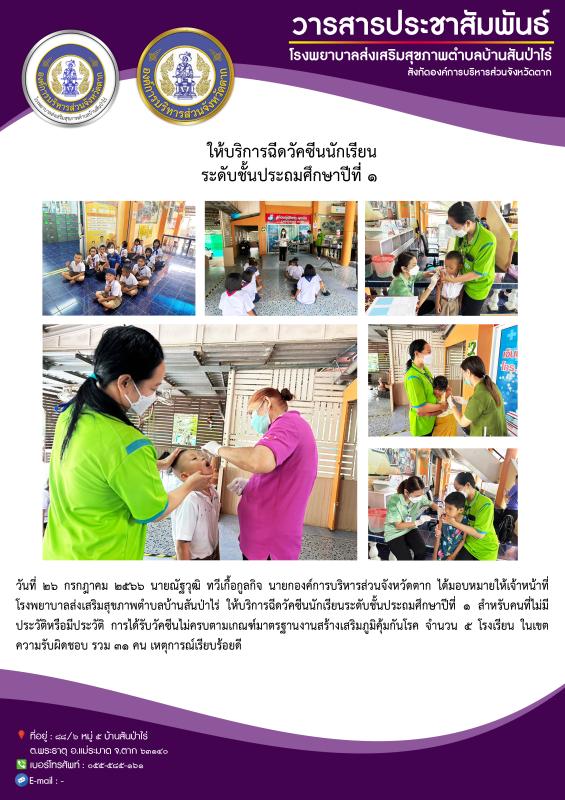26 ก.ค. 66 รพ.สต.บ้านสันป่าไร่ ให้บริการ ฉีดวัคซีนนักเรียน ชั้น ป.1 ที่ไม่มีประวัติหรือมีประวัติการได้รับวัคซีนไม่ครบตามเกณฑ์มาตรฐานงานสร้างเสริมภูมิคุ้มกันโรค จำนวน 5 โรงเรียนในเขตรับผิดชอบ รวม 31 คน