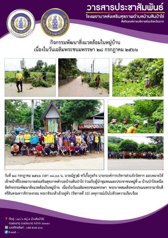 28 ก.ค. 66 จนท.รพ.สต.บ้านสันป่าไร่ ร่วมกับผู้นำชุมชนและประชาชน หมู่ที่ 3 บ้านป่าไร่เหนือ จัดกิจกรรมพัฒนาสิ่งแวดล้อมในหมู่บ้าน เนื่องในวันเฉลิมพระชนมพรรษา พระบาทสมเด็จพระเจ้าอยู่หัว รัชกาลที่ 10