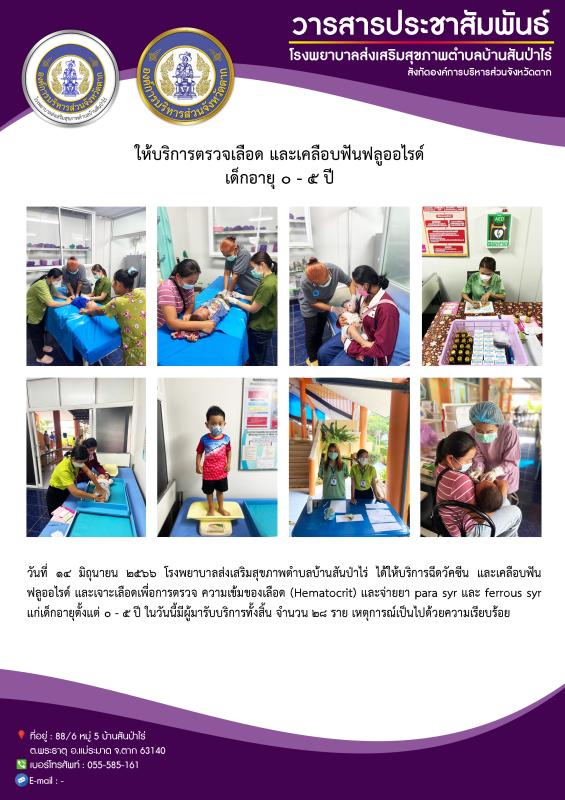 14 มิ.ย. 66 รพ.สต.บ้านสันป่าไร่ ให้บริการฉีดวัคซีน , เคลือบฟลูออไรด์ , เจาะเลือดตรวจ hct , จ่ายยา para syr และ ferrous syr เด็ก อายุ 0-5 ปี จำนวน 28 ราย
