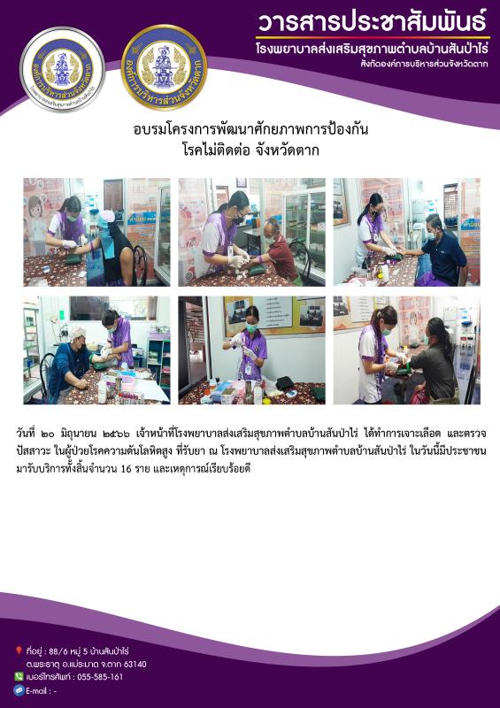 19-20 มิ.ย.66 จนท.รพ.สต.บ้านสันป่าไร่ (ผรช.งาน NCD) เข้าร่วมอบรมโครงการพัฒนาศักยภาพการป้องกันโรคไม่ติดต่อ จังหวัดตาก ณ โรงแรมวัฒนาวิลเลจรีสอร์ท อำเภอแม่สอด