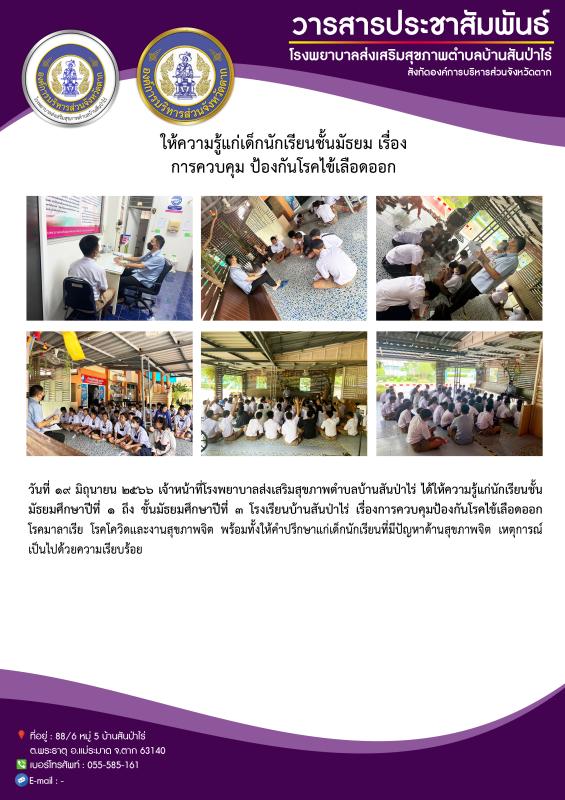 19 มิ.ย. 66 จนท.รพ.สต.บ้านสันป่าไร่ให้ความรู้แก่นักเรียนชั้นมัธยมศึกษาปีที่1-3 รร.บ้านสันป่าไร่ เรื่องการควบคุมป้องกันโรคไข้เลือดออก โรคมาลาเรีย โรคโควิดและงานสุขภาพจิต พร้อมทั้งให้คำปรึกษาเด็กนักเรียนที่มีปัญหาด้านสุขภาพจิต