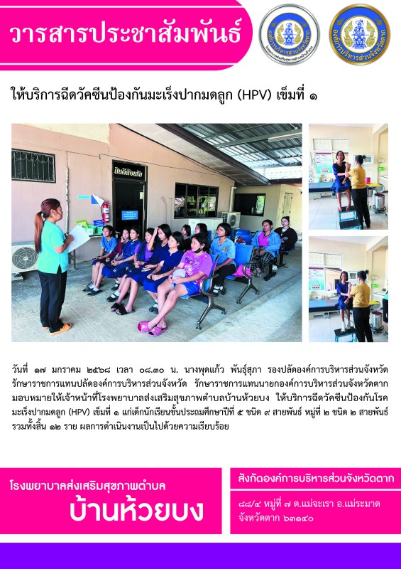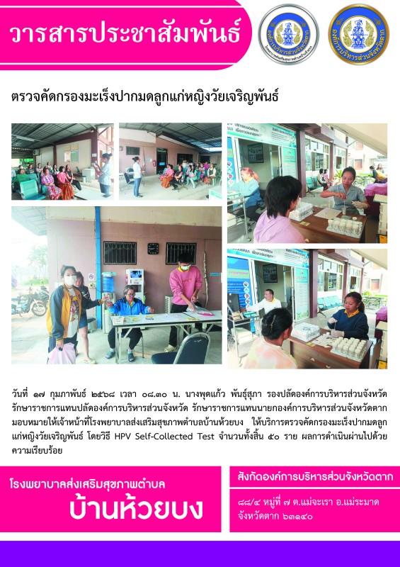 วันที่ ๑๗ กุมภาพันธ์ ๒๕๖๘ เวลา ๐๘.๓๐ น. นางพุดแก้ว พันธุ์สุภา รองปลัดองค์การบริหารส่วนจังหวัด รักษาราชการแทนปลัดองค์การบริหารส่วนจังหวัด รักษาราชการแทนนายกองค์การบริหารส่วนจังหวัดตาก มอบหมายให้เจ้าหน้าที่โรงพยาบาลส่งเสริมสุขภาพตำบลบ้านห้วยบง ให้บริการตรวจคัดกรองมะเร็งปากมดลูกแก่หญิงวัยเจริญพันธ์โดยวิธี HPV Self-Collected Test จำนวนทั้งสิ้น ๕๐ ราย ผลการดำเนินผ่านไปด้วยความเรียบร้อย