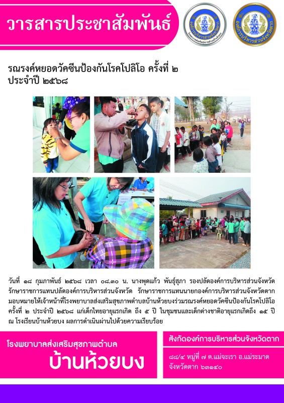 วันที่ ๑๘ กุมภาพันธ์ ๒๕๖๘ เวลา ๐๘.๓๐ น. นางพุดแก้ว พันธุ์สุภา รองปลัดองค์การบริหารส่วนจังหวัด รักษาราชการแทนปลัดองค์การบริหารส่วนจังหวัด รักษาราชการแทนนายกองค์การบริหารส่วนจังหวัดตาก มอบหมายให้เจ้าหน้าที่โรงพยาบาลส่งเสริมสุขภาพตำบลบ้านห้วยบงร่วมรณรงค์หยอดวัคซีนป้องกันโรคโปลิโอ ครั้งที่ ๒ ประจำปี ๒๕๖๘ แก่เด็กไทยอายุแรกเกิด ถึง ๕ ปี ในชุมชนและเด็กต่างชาติอายุแรกเกิดถึง ๑๕ ปี ณ โรงเรียนบ้านห้วยบงผลการดำเนินผ่านไปด้วยความเรียบร้อย