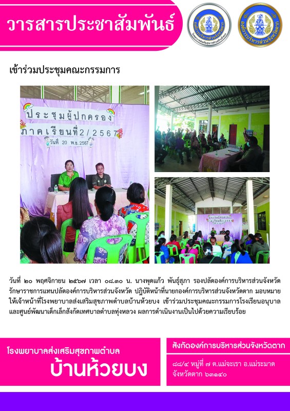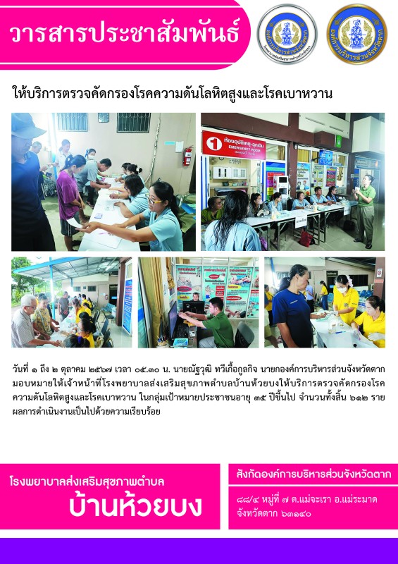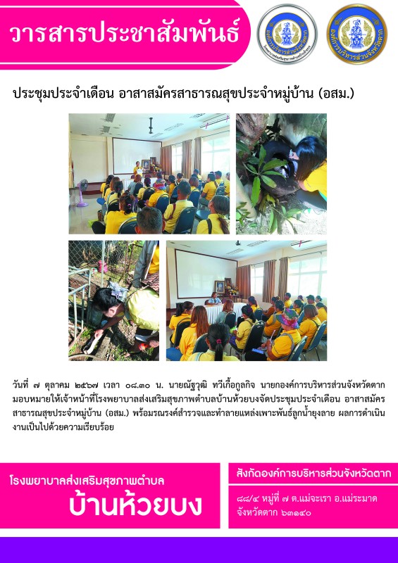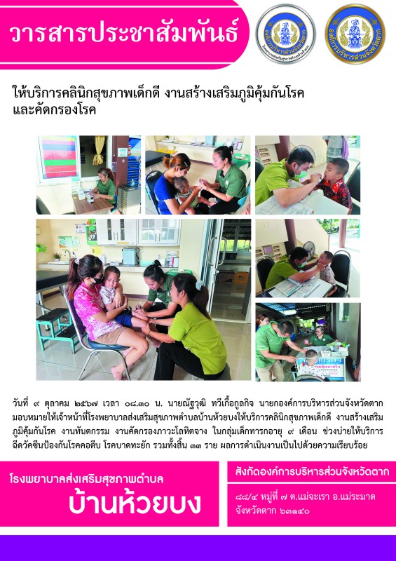 วันที่ ๑๕ มกราคม ๒๕๖๘ เวลา ๐๘.๓๐ น. นางพุดแก้ว พันธุ์สุภา รองปลัดองค์การบริหารส่วนจังหวัด รักษาราชการแทนปลัดองค์การบริหารส่วนจังหวัด รักษาราชการแทนนายกองค์การบริหารส่วนจังหวัดตาก มอบหมายให้เจ้าหน้าที่โรงพยาบาลส่งเสริมสุขภาพตำบลบ้านห้วยบงร่วมกับอาสาสมัครสาธารณสุขประจำหมู่บ้าน (อสม.)และคณะคุณครูโรงเรียนบ้านห้วยบง รณรงค์ให้วัคซีนป้องกันโรคโปลิโอเสริม ปี ๒๕๖๘ (ครั้งที่ ๑)แก่เด็กไทยอายุ ๐ ถึง ๕ ปี จำนวน ๕๖ ราย และเด็กต่างชาติอายุต่ำกว่า ๑๕ ปี จำนวน ๑๖๘ ราย รวมทั้งสิ้น ๒๒๔ รายผลการดำเนินงานเป็นไปด้วยความเรียบร้อย