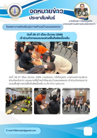 วันที่ 26-27 เดือน มีนาคม 2569 นางอัจฉรา ทวีเกือกูลกิจ นายกองค์การบริหารส่วนจังหวัดตาก มอบหมายให้เจ้าหน้าที่รพ.สต.บ้านหนองหลวง เข้าร่วมกิจกรรมการอบรมฟิ้นฟูการช่วยฟื้นคืนชีพเบื้องต้น ณ ตึก PCC แม่ระมาด