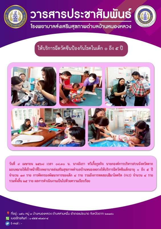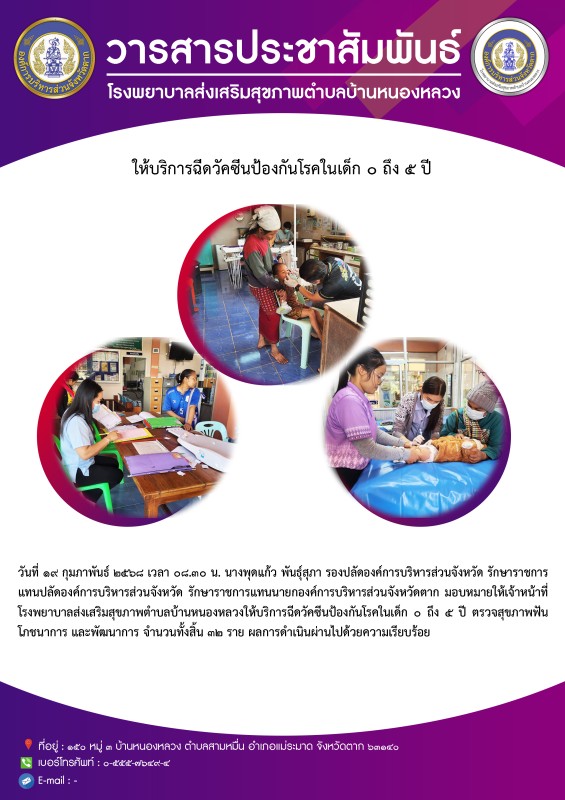 วันที่ ๑๙ กุมภาพันธ์ ๒๕๖๘ เวลา ๐๘.๓๐ น. นางพุดแก้ว พันธุ์สุภา รองปลัดองค์การบริหารส่วนจังหวัด รักษาราชการแทนปลัดองค์การบริหารส่วนจังหวัด รักษาราชการแทนนายกองค์การบริหารส่วนจังหวัดตาก มอบหมายให้เจ้าหน้าที่โรงพยาบาลส่งเสริมสุขภาพตำบลบ้านหนองหลวงให้บริการฉีดวัคซีนป้องกันโรคในเด็ก ๐ ถึง ๕ ปีตรวจสุขภาพฟัน โภชนาการ และพัฒนาการ จำนวนทั้งสิ้น ๓๒ ราย ผลการดำเนินผ่านไปด้วยความเรียบร้อย