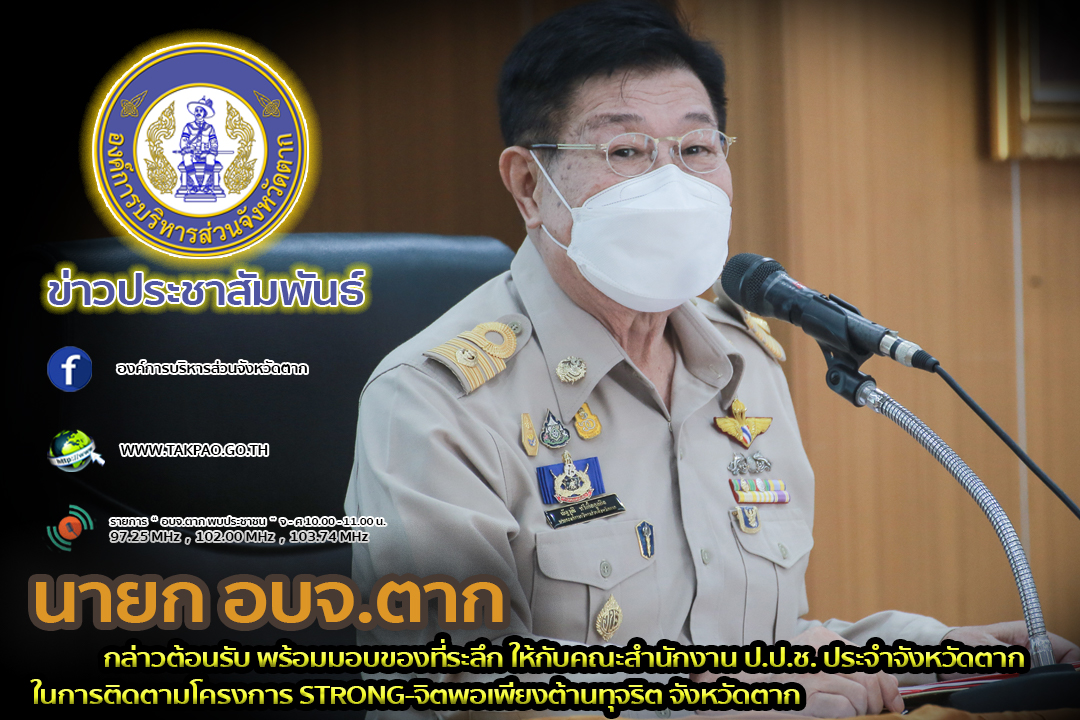 วันที่ 3 มีนาคม 2565 เวลา 9.00 น. นายณัฐวุฒิ ทวีเกื้อกูลกิจ นายกองค์การบริหารส่วนจังหวัดตาก กล่าวต้อนรับ พร้อมมอบของที่ระลึก ให้กับคณะสำนักงาน ป.ป.ช. ประจำจังหวัดตาก ในการติดตามโครงการ STRONG-จิตพอเพียงต้านทุจริต จังหวัดตาก ซึ่งโครงการนี้มีวัตถุประสงค์เพื่อเป็นการประชุมแลกเปลี่ยนเรียนรู้เกี่ยวกับการเฝ้าระวังและแจ้งเบาะแสการดำเนินโครงการของหน่วยงานภาครัฐให้กับโค้ช กรรมการ สมาชิกชมรม STRONG - จิตพอเพียงต้านทุจริตจังหวัดตาก และภาคประชาชน จำนวน 20 คน โดยในส่วนขององค์การบริหารส่วนจังหวัดตาก ได้จัดเตรียมข้อมูลเกี่ยวกับการดำเนินโครงการจ้างก่อสร้างปรับปรุงถนนโดยซ่อมแซมเป็นผิวทางแอสฟัลท์ติกคอนกรีต สายทางที่ ตก.ถ 1-0039 หมู่ที่ 4 ต.ตากตก-ต.หนองบัวเหนือ(อ.บ้านตาก-อ.เมืองตาก) จังหวัดตาก และร่วมลงพื้นที่สังเกตการณ์การดำเนินโครงการฯดังกล่าว ร่วมกับเครือข่ายชมรม STRONG - จิตพอเพียงต้านทุจริตจังหวัดตาก และภาคประชาชนด้วย