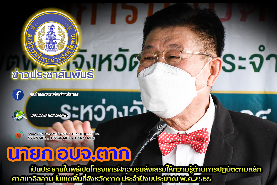 นายณัฐวุฒิ ทวีเกื้อกูลกิจ นายกองค์การบริหารส่วนจังหวัดตาก เป็นประธานในพิธีเปิดโครงการฝึกอบรมส่งเสริมให้ความรู้ด้านการปฏิบัติตามหลักศาสนาอิสลาม ในเขตพื้นที่จังหวัดตาก ประจำปีงบประมาณ พ.ศ. 2565 พร้อมด้วยว่าที่ ดร.ฑีฆะพล ทวีเกื้อกูลกิจ รองนายกองค์การบริหารส่