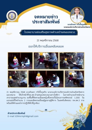 21 พฤศจิกายน 2568 นางอัจฉรา ทวีเกื้อกูลกิจ นายกองค์การบริหารองค์การส่วนจังหวัดตาก มอบหมาย ให้เจ้าหน้าที่รพ.สต.บ้านหนองหลวง นางสาวโชติกา โอภาสอำนวย ลงพื้นที่ติดตามเยี่ยมหญิงตั้งครรภ์ในโครงการมหัศจรรย์ 1,000 วันแรกแห่งชีวิต จำนวน 2 รายและติดตามเยี่ยมผู้สูงอายุ ผู้พิการ ในเขตรับผิดชอบ รพ.สต.3 ราย พร้อมให้คำแนะนำการปฏิบัติตัวที่ถูกต้อง