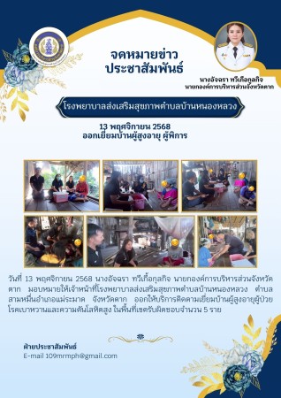 วันที่ 13 พฤศจิกายน 2568 นางอัจฉรา ทวีเกื้อกุลกิจ นายกองค์การบริหารส่วนจังหวัดตาก มอบหมายให้เจ้าหน้าที่โรงพยาบาลส่งเสริมสุขภาพตำบลบ้านหนองหลวง ตำบลสามหมื่นอำเภอแม่ระมาด จังหวัดตาก ออกให้บริการติดตามเยี่ยมบ้านผู้สูงอายุผู้ป่วยโรคเบาหวานและความดันโลหิตสูง ในพื้นที่เขตรับผิดชอบจำนวน 5 ราย
