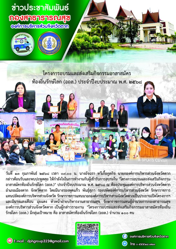 รองนายกองค์การบริหารส่วนจังหวัดตาก เป็นประธานเปิดโครงการอบรมและส่งเสริมกิจกรรมอาสาสมัครท้องถิ่นรักษ์โลก (อถล.) ประจำปีงบประมาณ พ.ศ. 2567