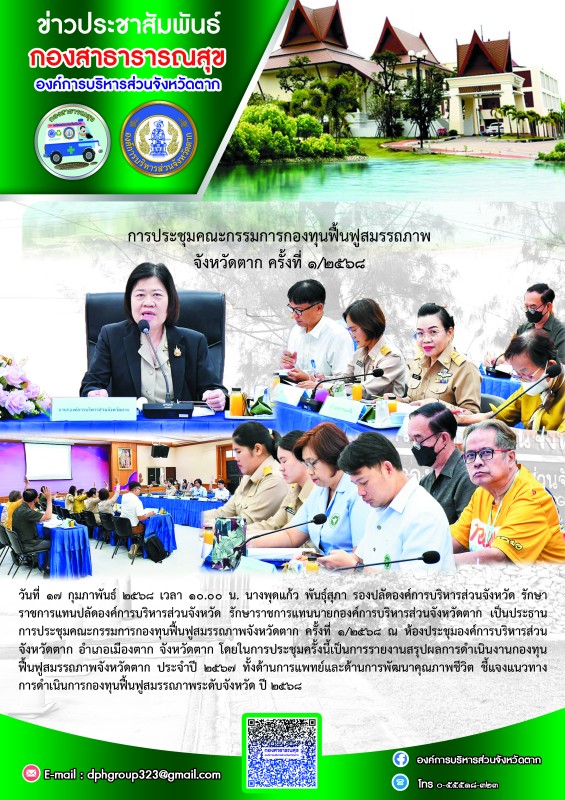 อบจ.ตาก จัดการประชุมคณะกรรมการกองทุนฟื้นฟูสมรรถภาพจังหวัดตาก ครั้งที่ 1/2568 วันที่ 17 กุมภาพันธ์ 2568 เวลา 10.00 น. นางพุดแก้ว พันธุ์สุภา รองปลัดองค์การบริหารส่วนจังหวัด รักษาราชการแทนปลัดองค์การบริหารส่วนจังหวัด รักษาราชการแทนนายกองค์การบริหารส่วนจังหวัดตาก เป็นประธานการประชุมคณะกรรมการกองทุนฟื้นฟูสมรรถภาพจังหวัดตาก ครั้งที่ 1/2568 ณ ห้องประชุมองค์การบริหารส่วนจังหวัดตาก อำเภอเมืองตาก จังหวัดตาก โดยในการประชุมครั้งนี้เป็นการรายงานสรุปผลการดำเนินงานกองทุนฟื้นฟูสมรรถภาพจังหวัดตาก ประจำปี 2567 ทั้งด้านการแพทย์และด้านการพัฒนาคุณภาพชีวิต ชี้แจงแนวทางการดำเนินการกองทุนฟื้นฟูสมรรถภาพระดับจังหวัด ปี 2568