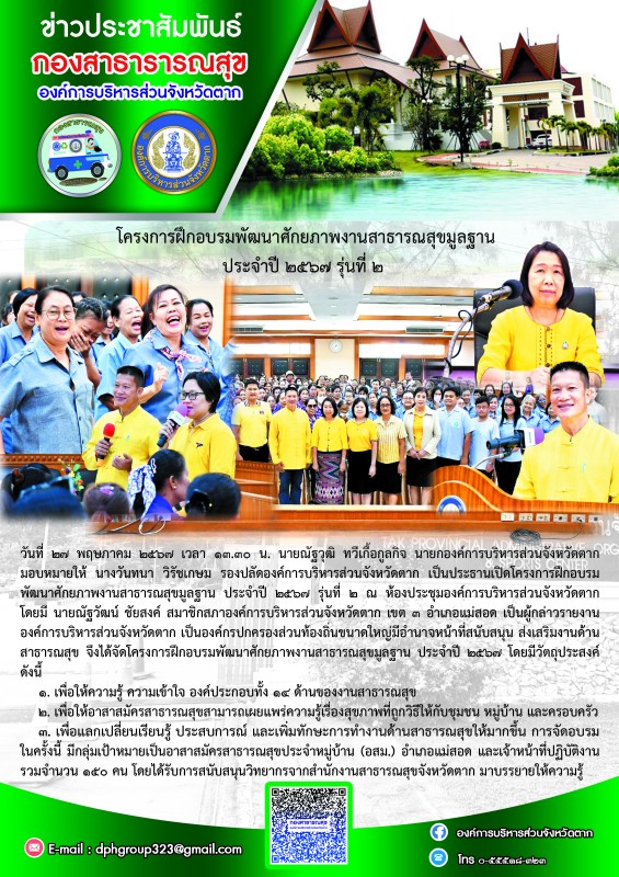 ที่ปรึกษานายกองค์การบริหารส่วนจังหวัดตาก เป็นประธานเปิดโครงการฝึกอบรมพัฒนาศักยภาพงานสาธารณสุขมูลฐาน ประจำปี 2567 รุ่นที่ 3