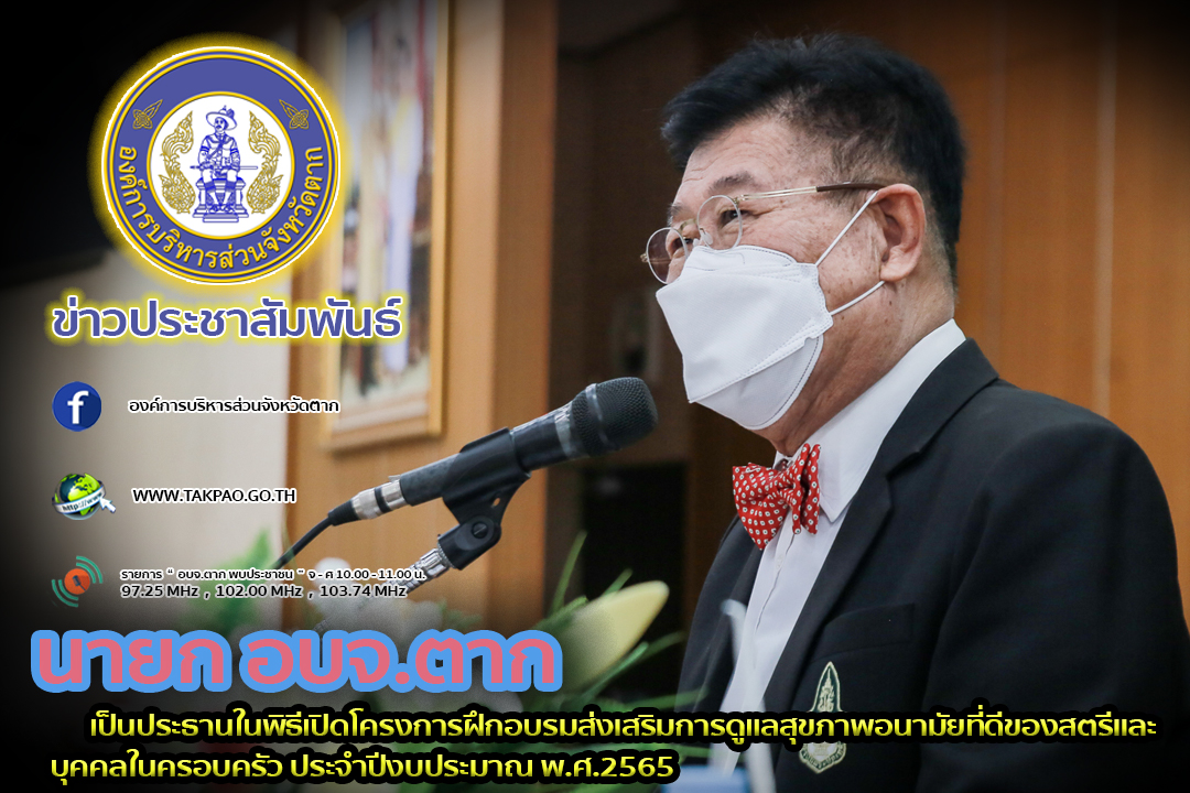 นายกองค์การบริหารส่วนจังหวัดตาก เป็นประธานในพิธีเปิดโครงการฝึกอบรมส่งเสริมการดูแลสุขภาพอนามัยที่ดีของสตรีและบุคคลในครอบครัว ประจำปีงบประมาณ พ.ศ. 2565 พร้อมด้วยว่าที่ ดร.ฑีฆะพล ทวีเกื้อกูลกิจ รองนายกองค์การบริหารส่วนจังหวัดตาก