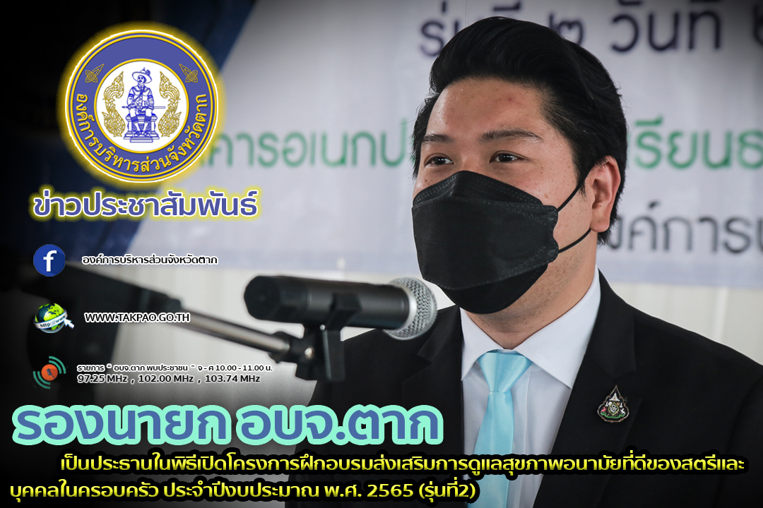 รองนายกองค์การบริหารส่วนจังหวัดตาก เป็นประธานในพิธีเปิดโครงการฝึกอบรมส่งเสริมการดูแลสุขภาพอนามัยที่ดีของสตรีและบุคคลในครอบครัว ประจำปีงบประมาณ พ.ศ. 2565 (รุ่นที่2)