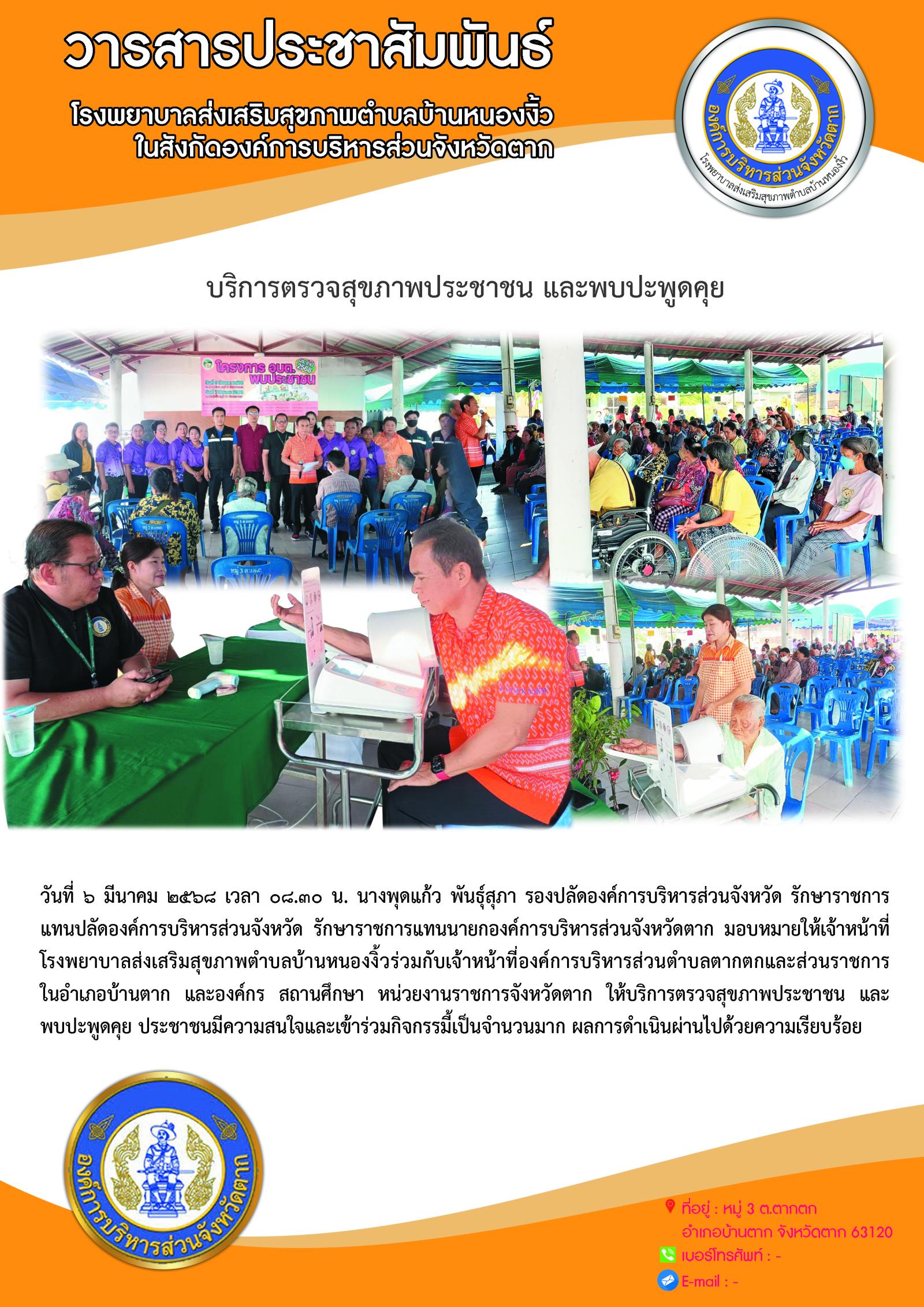 เจ้าหน้าที่โรงพยาบาลส่งเสริมสุขภาพตำบลบ้านหนองงิ้วร่วมกับเจ้าหน้าที่องค์การบริหารส่วนตำบลตากตกและส่วนราชการในอำเภอบ้านตากและองค์กร สถานศึกษา หน่วยงานราชการจังหวัดตาก ให้บริการตรวจสุขภาพประชาชน และพบปะพูดคุย