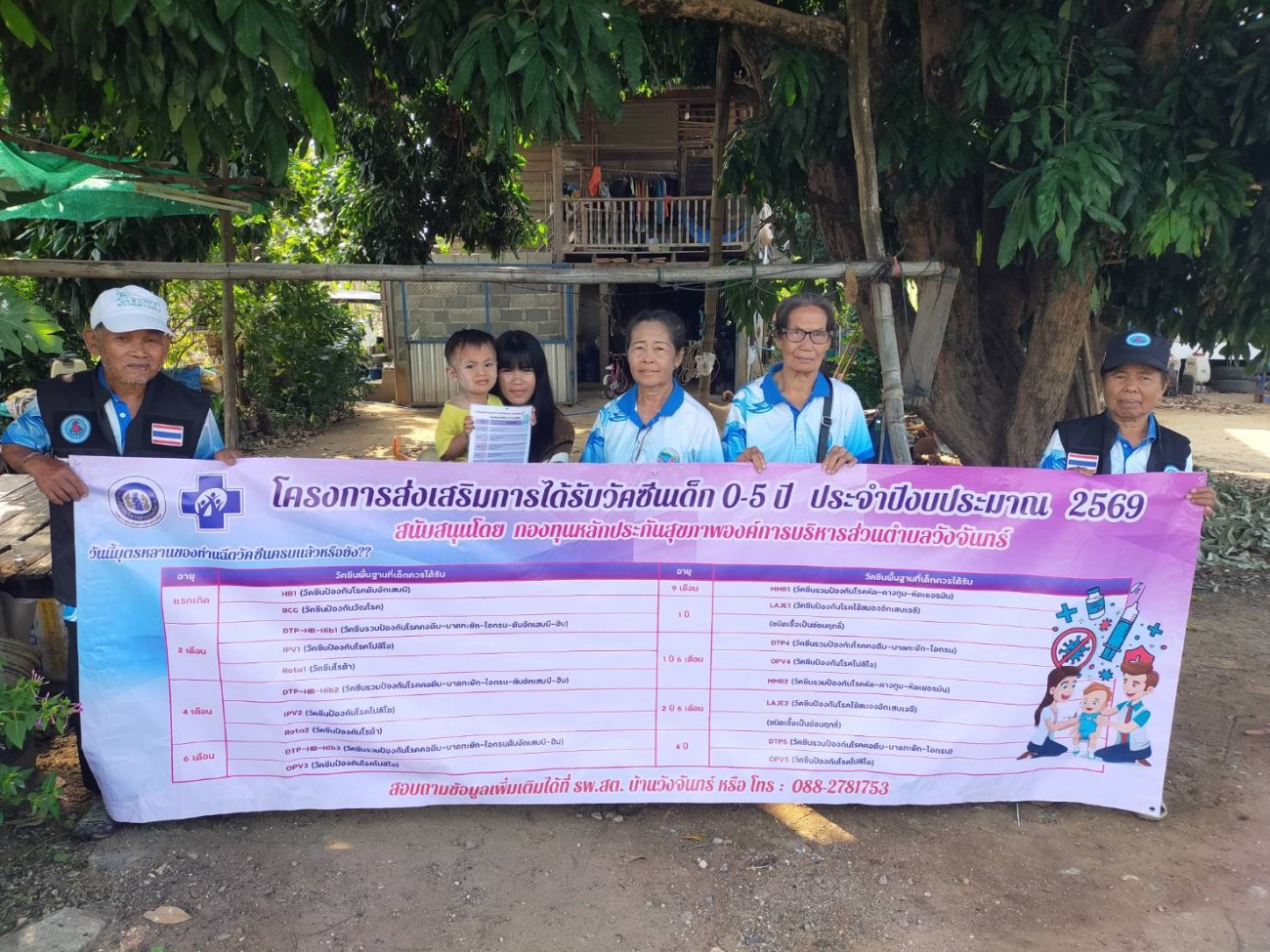 วันที่ 16 มีนาคม 2569 เวลา 08.30 น. นางอัจฉรา ทวีเกื้อกูลกิจ นายกองค์การบริหารส่วนจังหวัดตาก มอบหมายให้นางสาวชุติมา วงษ์คำ นักวิชาการสาธารณสุขปฏิบัติการ โรงพยาบาลส่งเสริมสุขภาพตำบลบ้านวังจันทร์ ดำเนินกิจกรรมโครงการส่งเสริมการได้รับวัคซีนในเด็ก 0-5 ปี ประจำปีงบประมาณ 2569 เพื่อประชาสัมพันธ์และส่งเสริมให้เด็กอายุ 0-5 ปีได้รับวัคซีนครบตามเกณฑ์มาตรฐานในพื้นที่ หมู่ที่ 1 - หมู่ที่ 3 ตำบลวังจันทร์ อำเภอสามเงา จังหวัดตาก