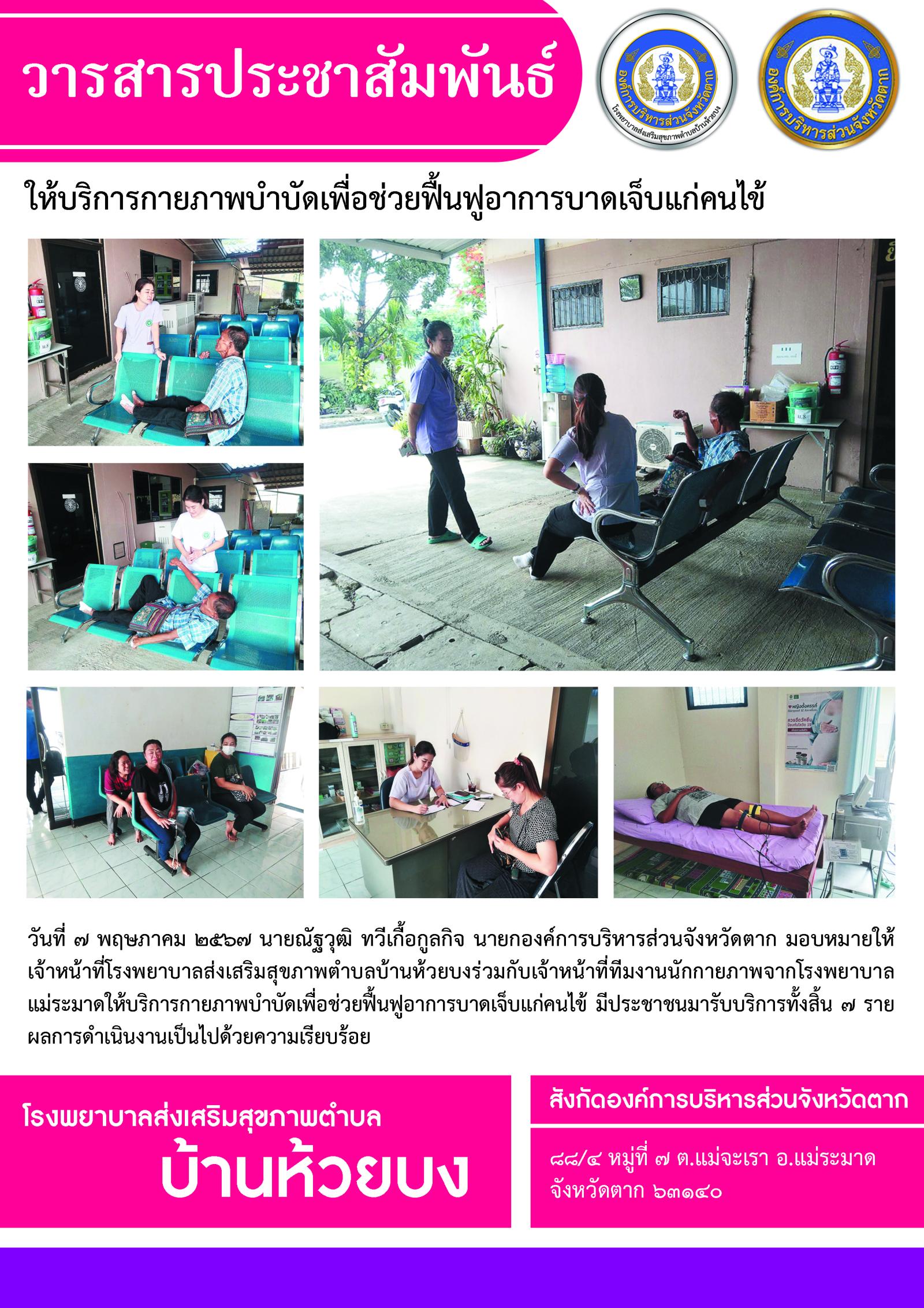 ให้บริการกายภาพบำบัดเพื่อช่วยฟื้นฟูอาการบาดเจ็บแก่คนไข้ มีประชาชนมารับบริการทั้งสิ้น ๗ ราย ผลการดำเนินงานเป็นไปด้วยความเรียบร้อย
