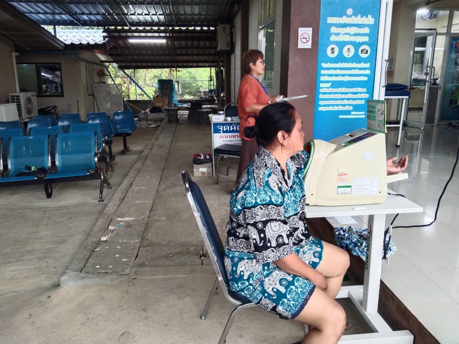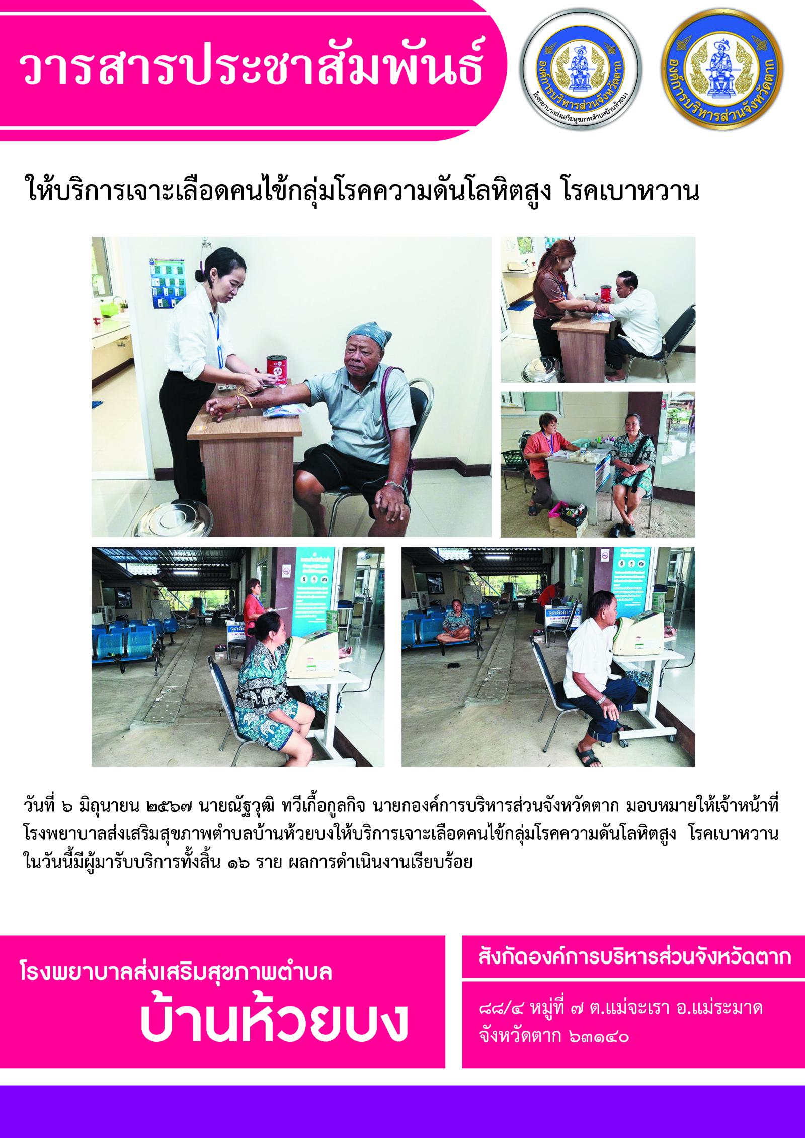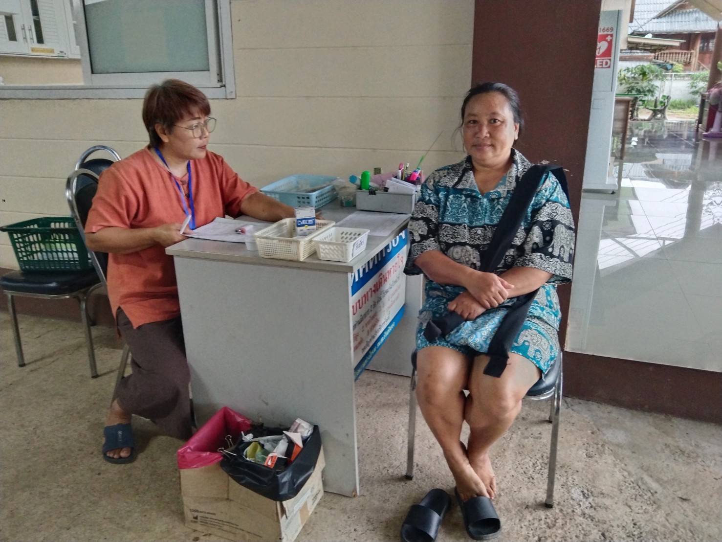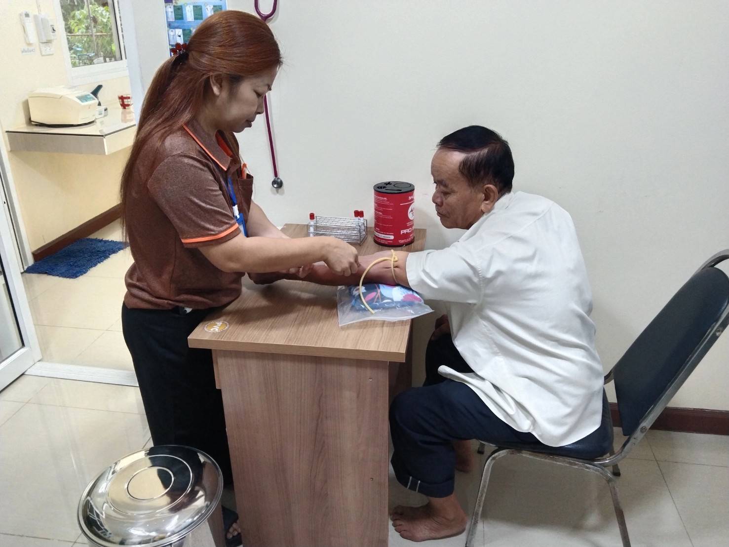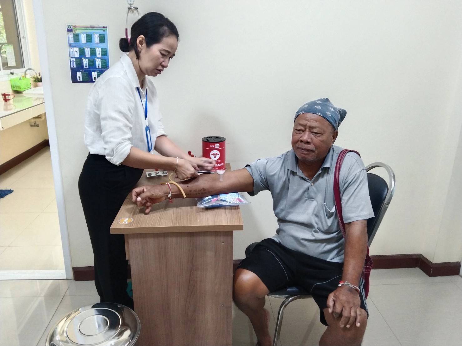 เจ้าหน้าที่โรงพยาบาลส่งเสริมสุขภาพตำบลบ้านห้วยบงให้บริการเจาะเลือดคนไข้กลุ่มโรคความดันโลหิตสูง โรคเบาหวาน