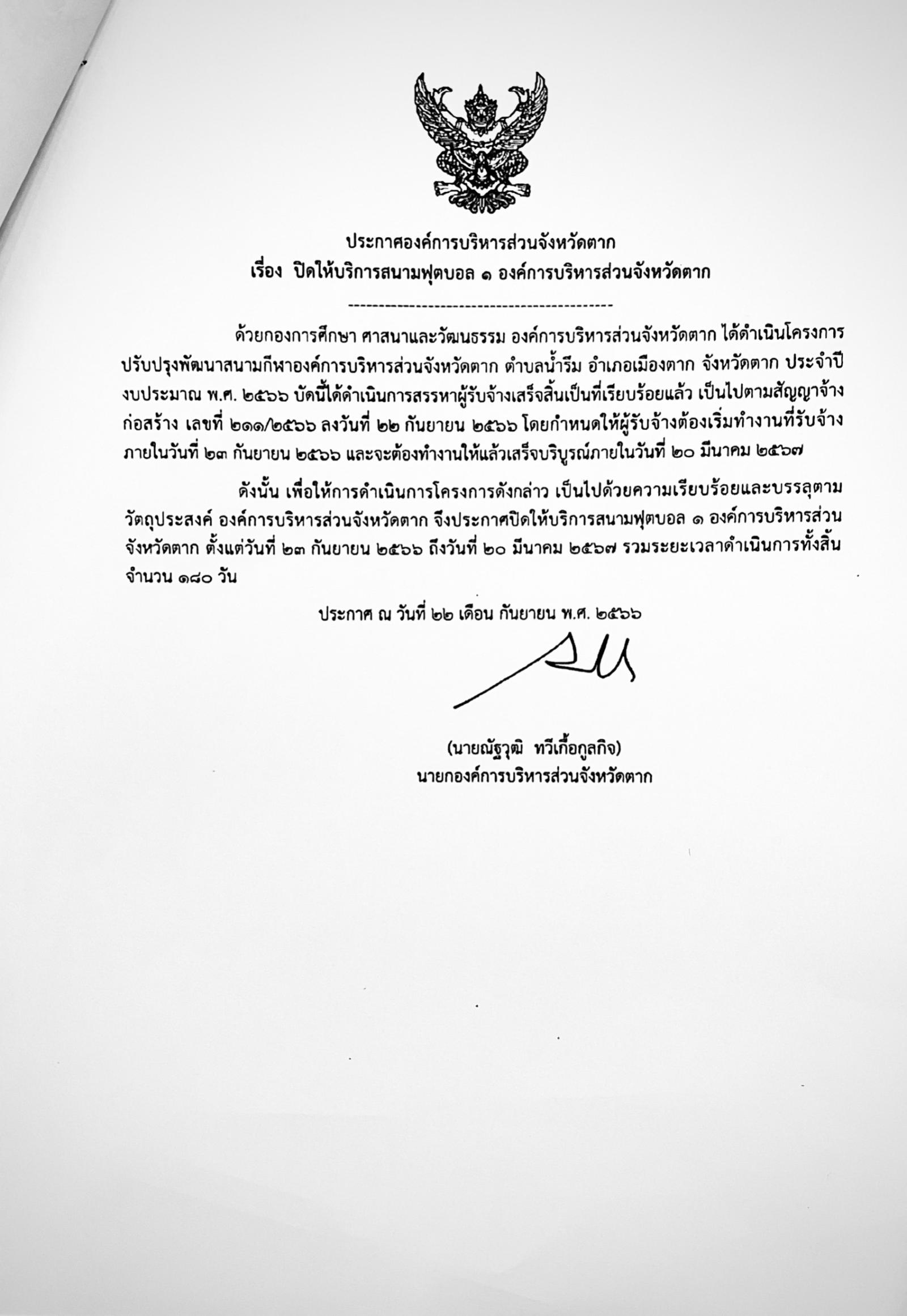 ประกาศองค์การบริหารส่วนจังหวัดตาก เรื่อง ปิดให้บริการสนามฟุตบอล 1 องค์การบริหารส่วนจังหวัดตาก ตั้งแต่วันที่ 23 กันยายน 2566 ถึงวันที่ 20 มีนาคม 2567 เพื่อดำเนินการปรับปรุงพัฒนาสนามกีฬาองค์การบริหารส่วนจังหวัดตาก และเพื่อความปลอดภัยแก่ประชาชนที่มาใช้บริการ ⚽️