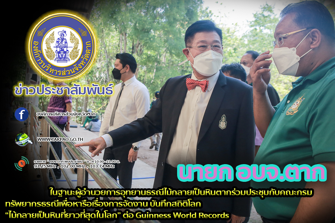 วันที่ 4 เมษายน พ.ศ. 2565 นายณัฐวุฒิ ทวีเกื้อกูลกิจ นายกองค์การบริหารส่วนจังหวัดตาก ในฐานะผู้อำนวยการอุทยานธรณีไม้กลายเป็นหินตาก พร้อมด้วยว่าที่ ดร.ฑีฆะพล ทวีเกื้อกูลกิจ รองนายกองค์การบริหารส่วนจังหวัดตาก คณะผู้บริหาร และเจ้าหน้าที่ องค์การบริหารส่วนจังหวัดตาก เข้าร่วมการประชุมหารือการดำเนินโครงการอุทยานธรณีไม้กลายเป็นหินตาก ร่วมกับ กรมทรัพยากรธรณี โดยมีเจ้าหน้าที่กองธรณีวิทยา และเจ้าหน้าที่จากสำนักงานทรัพยากรธรณีเขต 1 พร้อมคณะทำงานอุทยานธรณีไม้กลายเป็นหินตาก เข้าร่วมประชุม ณ ห้องประชุมสภาองค์การบริหารส่วนจังหวัดตาก เพื่อติดตามการเตรียมการประกาศให้ไม้กลายเป็นหินตาก เป็น “ไม้กลายเป็นหินที่ยาวที่สุดในโลก” ต่อ Guinness World Records ซึ่งจะมีขึ้นในวันที่ 29 เมษายน 2565 ที่จะถึงนี้ จึงมีการหารือร่วมกันในหลายมิติ เพื่อยกระดับอุทยานธรณีไม้กลายเป็นหินตาก ต่อยอดสู่ระดับโลกต่อไป