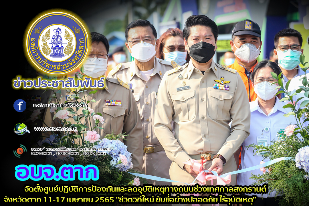 อบจ.ตาก จัดตั้งศูนย์ปฏิบัติการป้องกันและลดอุบัติเหตุทางถนนช่วงเทศกาลสงกรานต์จังหวัดตาก 11-17 เมษายน 2565 "ชีวิตวิถีใหม่ ขับขี่อย่างปลอดภัย ไร้อุบัติเหตุ”