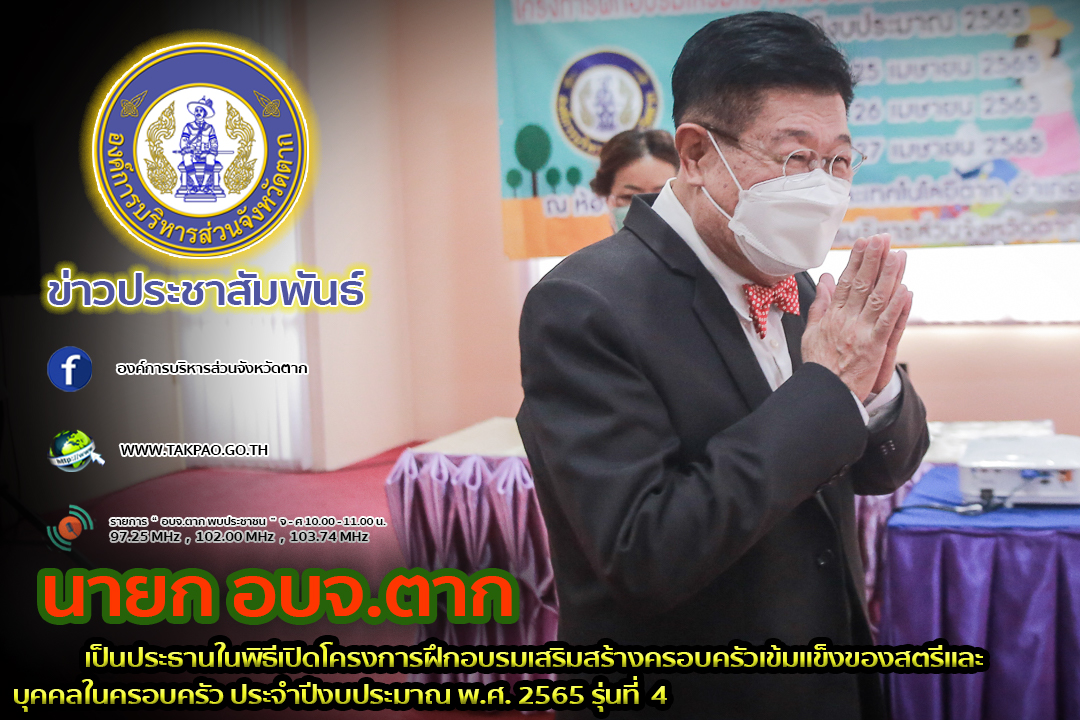 นายก อบจ.ตาก เป็นประธานในพิธีเปิดโครงการฝึกอบรมเสริมสร้างครอบครัวเข้มแข็งของสตรีและบุคคลในครอบครัว ประจำปีงบประมาณ พ.ศ. 2565 รุ่นที่ 4