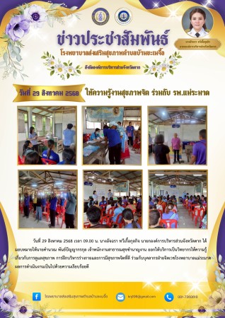 วันที่ 29 สิงหาคม 2568 เวลา 09.00 น. นางอัจฉรา ทวีเกื้อกูลกิจ นายกองค์การบริหารส่วนจังหวัดตาก ได้มอบหมายให้นายคำนวณ พันธ์ปัญญากรกุล เจ้าพนักงานสาธารณสุขชำนาญงาน ออกให้บริการเป็นวิทยากรให้ความรู้เกี่ยวกับการดูแลสุขภาพ การฝึกบริหารร่างกายและการมีสุขภาพจิตที่ดี ร่วมกับบุคลากรฝ่ายจิตเวชโรงพยาบาลแม่ระมาด ผลการดำเนินงานเป็นไปด้วยความเรียบร้อยดี