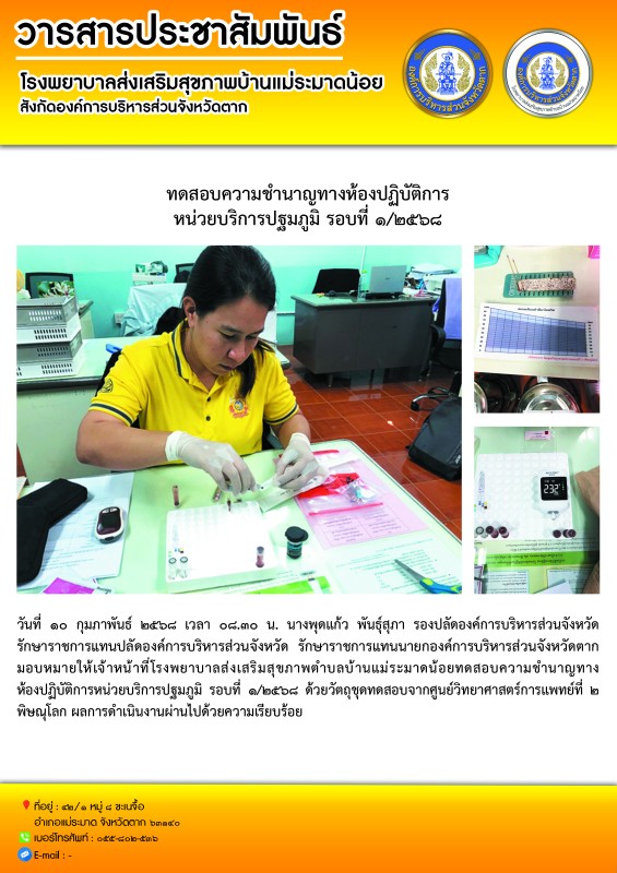 วันที่ ๑๐ กุมภาพันธ์ ๒๕๖๘ เวลา ๐๘.๓๐ น. นางพุดแก้ว พันธุ์สุภา รองปลัดองค์การบริหารส่วนจังหวัด รักษาราชการแทนปลัดองค์การบริหารส่วนจังหวัด รักษาราชการแทนนายกองค์การบริหารส่วนจังหวัดตาก มอบหมายให้เจ้าหน้าที่โรงพยาบาลส่งเสริมสุขภาพตำบลบ้านแม่ระมาดน้อยทดสอบความชำนาญทางห้องปฏิบัติการหน่วยบริการปฐมภูมิ รอบที่ ๑/๒๕๖๘ ด้วยวัตถุชุดทดสอบจากศูนย์วิทยาศาสตร์การแพทย์ที่ ๒ พิษณุโลก ผลการดำเนินงานผ่านไปด้วยความเรียบร้อยผลการดำเนินงานผ่านไปด้วยความเรียบร้อย