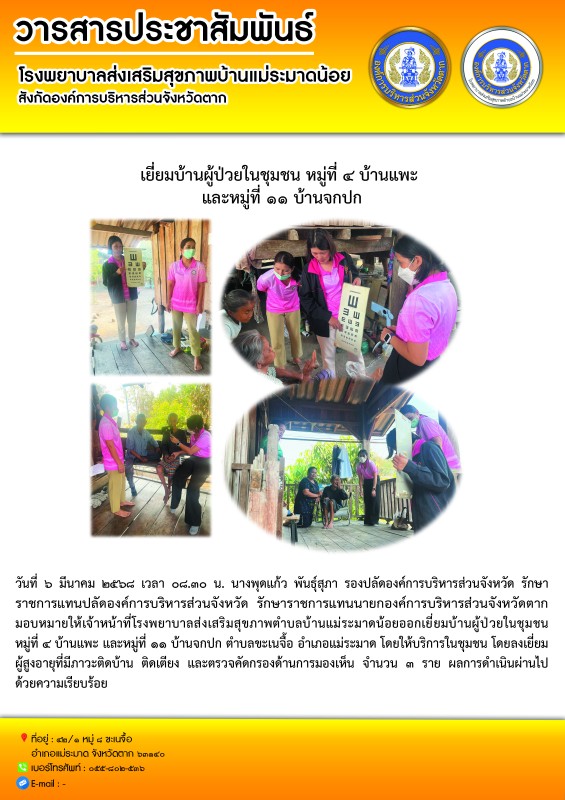 วันที่ ๖ มีนาคม ๒๕๖๘ เวลา ๐๘.๓๐ น. นางพุดแก้ว พันธุ์สุภา รองปลัดองค์การบริหารส่วนจังหวัด รักษาราชการแทนปลัดองค์การบริหารส่วนจังหวัด รักษาราชการแทนนายกองค์การบริหารส่วนจังหวัดตาก มอบหมายให้เจ้าหน้าที่โรงพยาบาลส่งเสริมสุขภาพตำบลบ้านแม่ระมาดน้อยออกเยี่ยมบ้านผู้ป่วยในชุมชน หมู่ที่ ๔ บ้านแพะ และหมู่ที่ ๑๑ บ้านจกปก ตำบลขะเนจื้อ อำเภอแม่ระมาด โดยให้บริการในชุมชน โดยลงเยี่ยมผู้สูงอายุที่มีภาวะติดบ้าน ติดเตียงและตรวจคัดกรองด้านการมองเห็น จำนวน ๓ ราย ผลการดำเนินผ่านไปด้วยความเรียบร้อย