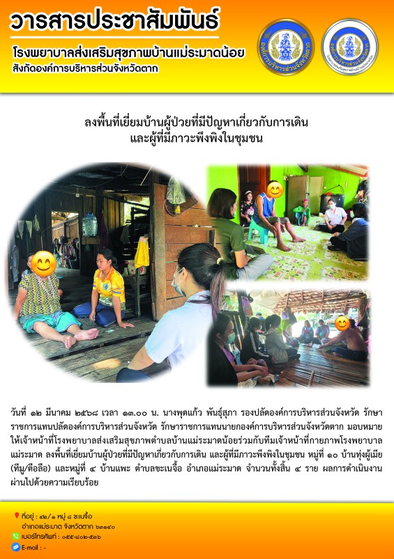 วันที่ ๑๒ มีนาคม ๒๕๖๘ เวลา ๑๓.๐๐ น. นางพุดแก้ว พันธุ์สุภา รองปลัดองค์การบริหารส่วนจังหวัด รักษาราชการแทนปลัดองค์การบริหารส่วนจังหวัด รักษาราชการแทนนายกองค์การบริหารส่วนจังหวัดตาก มอบหมายให้เจ้าหน้าที่โรงพยาบาลส่งเสริมสุขภาพตำบลบ้านแม่ระมาดน้อยร่วมกับทีมเจ้าหน้าที่กายภาพโรงพยาบาลแม่ระมาดลงพื้นที่เยี่ยมบ้านผู้ป่วยที่มีปัญหาเกี่ยวกับการเดิน และผู้ที่มีภาวะพึงพิงในชุมชน หมู่ที่ ๑๐ บ้านทุ่งผู้เมีย (ทีมู/ตือลือ)และหมู่ที่ ๔ บ้านแพะ ตำบลขะเนจื้อ อำเภอแม่ระมาด จำนวนทั้งสิ้น ๔ ราย ผลการดำเนินงานผ่านไปด้วยความเรียบร้อย