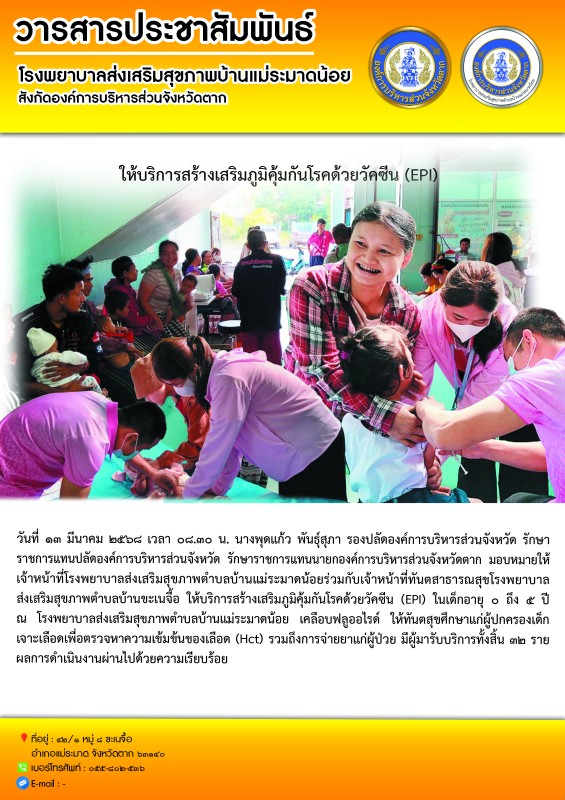 วันที่ ๑๓ กุมภาพันธ์ ๒๕๖๘ เวลา ๐๘.๓๐ น. นางพุดแก้ว พันธุ์สุภา รองปลัดองค์การบริหารส่วนจังหวัด รักษาราชการแทนปลัดองค์การบริหารส่วนจังหวัด รักษาราชการแทนนายกองค์การบริหารส่วนจังหวัดตาก มอบหมายให้เจ้าหน้าที่โรงพยาบาลส่งเสริมสุขภาพตำบลบ้านแม่ระมาดน้อยให้บริการสร้างเสริมภูมิคุ้มกันโรคด้วยวัคซีน (EPI) ในเด็กเล็กอายุ ๐ ถึง ๕ ปีโดยดำเนินการ ดังนี้- ตรวจคัดกรองพัฒนาตามช่วงวัย จำนวน ๗ ราย- ตรวจคัดกรองภาวะโลหิตจาง (HCT) จำนวน ๖ ราย- จ่ายวิตามินเสริมธาตุเหล็ก ferrous syr จำนวน ๗ รายรวมจำนวนทั้งสิ้น ๒๐ ราย ผลการดำเนินงานผ่านไปด้วยความเรียบร้อย