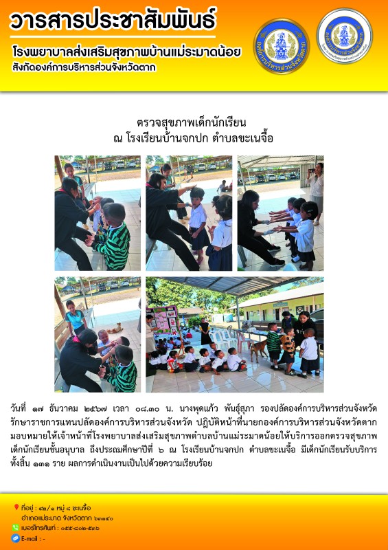 วันที่ 17 ธันวาคม ๒๕๖๗ เวลา 08.30 น. นางพุดแก้ว พันธุ์สุภา รองปลัดองค์การบริหารส่วนจังหวัด รักษาราชการแทนปลัดองค์การบริหารส่วนจังหวัด ปฎิบัติหน้าที่นายกองค์การบริหารส่วนจังหวัดตาก มอบหมายให้เจ้าหน้าที่โรงพยาบาลส่งเสริมสุขภาพตำบลบ้านแม่ระมาดน้อยให้บริการออกตรวจสุขภาพเด็กนักเรียนชั้นอนุบาล ถึงประถมศึกษาปีที่ 6ณ โรงเรียนบ้านจกปก ตำบลขะเนจื้อ มีเด็กนักเรียนรับบริการทั้งสิ้น 131 ราย ผลการดำเนินงานเป็นไปด้วยความเรียบร้อย