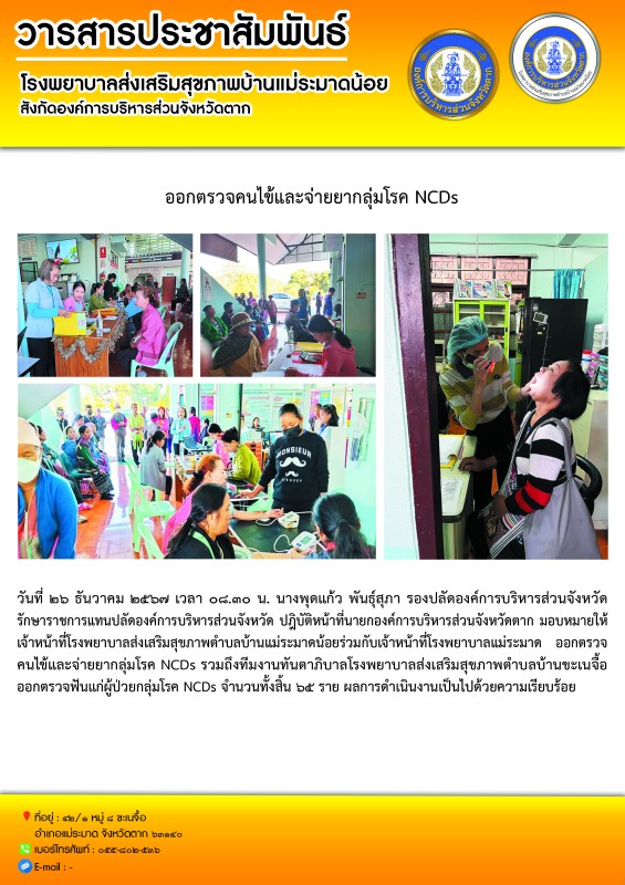 วันที่ ๒๖ ธันวาคม ๒๕๖๗ เวลา ๐๘.๓๐ น. นางพุดแก้ว พันธุ์สุภา รองปลัดองค์การบริหารส่วนจังหวัด รักษาราชการแทนปลัดองค์การบริหารส่วนจังหวัด ปฎิบัติหน้าที่นายกองค์การบริหารส่วนจังหวัดตาก มอบหมายให้เจ้าหน้าที่โรงพยาบาลส่งเสริมสุขภาพตำบลบ้านแม่ระมาดน้อยร่วมกับเจ้าหน้าที่โรงพยาบาลแม่ระมาดออกตรวจคนไข้และจ่ายยากลุ่มโรค NCDs รวมถึงทีมงานทันตาภิบาลโรงพยาบาลส่งเสริมสุขภาพตำบลบ้านขะเนจื้อออกตรวจฟันแก่ผู้ป่วยกลุ่มโรค NCDs จำนวนทั้งสิ้น ๖๕ ราย ผลการดำเนินงานเป็นไปด้วยความเรียบร้อย