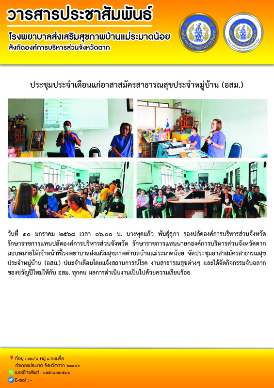 วันที่ ๑๐ มกราคม ๒๕๖๘ เวลา ๐๖.๐๐ น. นางพุดแก้ว พันธุ์สุภา รองปลัดองค์การบริหารส่วนจังหวัด รักษาราชการแทนปลัดองค์การบริหารส่วนจังหวัด รักษาราชการแทนนายกองค์การบริหารส่วนจังหวัดตาก มอบหมายให้เจ้าหน้าที่โรงพยาบาลส่งเสริมสุขภาพตำบลบ้านแม่ระมาดน้อย จัดประชุมอาสาสมัครสาธารณสุขประจำหมู่บ้าน (อสม.) ประจำเดือนโดยแจ้งสถานการณ์โรค งานสาธารณสุขต่างๆ และได้จัดกิจกรรมจับฉลากของขวัญปีใหม่ให้กับ อสม. ทุกคน ผลการดำเนินงานเป็นไปด้วยความเรียบร้อย