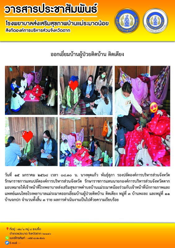 วันที่ ๑๕ มกราคม ๒๕๖๘ เวลา ๐๘.๓๐ น. นางพุดแก้ว พันธุ์สุภา รองปลัดองค์การบริหารส่วนจังหวัด รักษาราชการแทนปลัดองค์การบริหารส่วนจังหวัด รักษาราชการแทนนายกองค์การบริหารส่วนจังหวัดตาก มอบหมายให้เจ้าหน้าที่โรงพยาบาลส่งเสริมสุขภาพตำบลบ้านแม่ระมาดน้อยร่วมกับเจ้าหน้าที่นักกายภาพและแพทย์แผนไทยโรงพยาบาลแม่ระมาดออกเยี่ยมบ้านผู้ป่วยติดบ้าน ติดเตียง หมู่ที่ ๓ บ้านพะละ และหมู่ที่ ๑๑ บ้านจกปก จำนวนทั้งสิ้น ๓ ราย ผลการดำเนินงานเป็นไปด้วยความเรียบร้อย