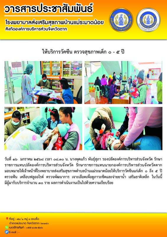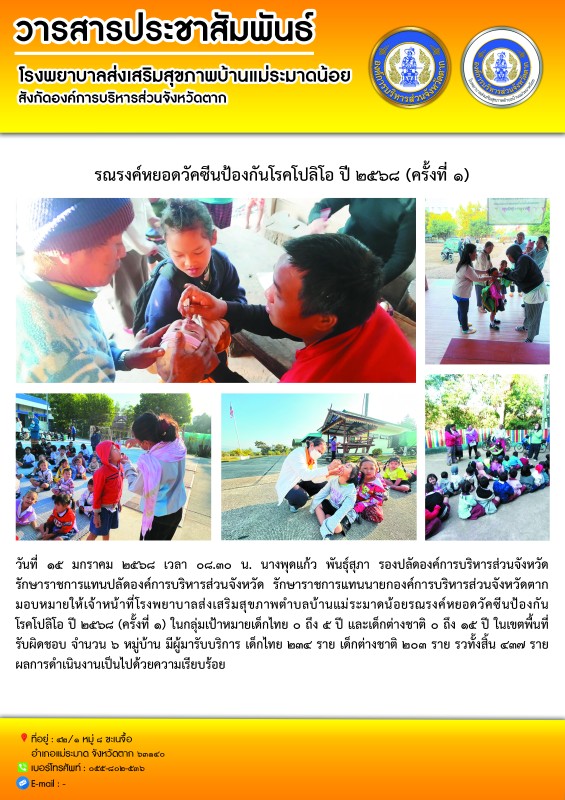 วันที่ ๑๕ มกราคม ๒๕๖๘ เวลา ๐๘.๓๐ น. นางพุดแก้ว พันธุ์สุภา รองปลัดองค์การบริหารส่วนจังหวัด รักษาราชการแทนปลัดองค์การบริหารส่วนจังหวัด รักษาราชการแทนนายกองค์การบริหารส่วนจังหวัดตาก มอบหมายให้เจ้าหน้าที่โรงพยาบาลส่งเสริมสุขภาพตำบลบ้านแม่ระมาดน้อยรณรงค์หยอดวัคซีนป้องกันโรคโปลิโอ ปี ๒๕๖๘ (ครั้งที่ ๑)ในกลุ่มเป้าหมายเด็กไทย ๐ ถึง ๕ ปี และเด็กต่างชาติ ๐ ถึง ๑๕ ปี ในเขตพื้นที่รับผิดชอบ จำนวน ๖ หมู่บ้านมีผู้มารับบริการ เด็กไทย ๒๓๔ ราย เด็กต่างชาติ ๒๐๓ ราย รวทั้งสิ้น ๔๓๗ ราย ผลการดำเนินงานเป็นไปด้วยความเรียบร้อย